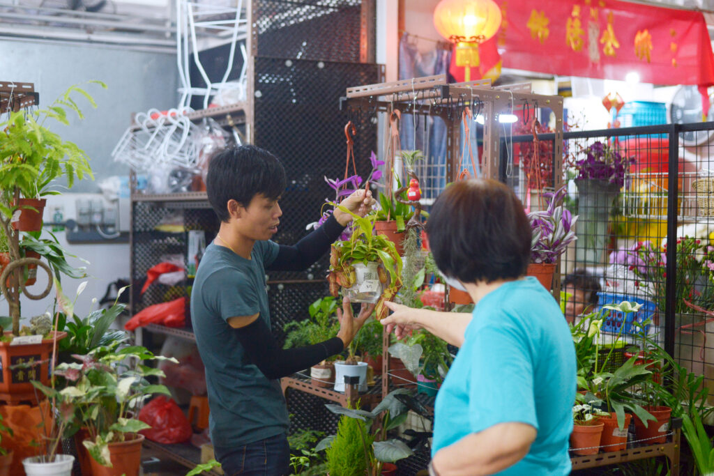 But even at a market this busy, there is a relatively out-of-the-way spot without many visitors. At Bukit Merah View, this happens to be where you can find a verdant, vibrant row of three stalls offering plants for ornamental/religious purposes.