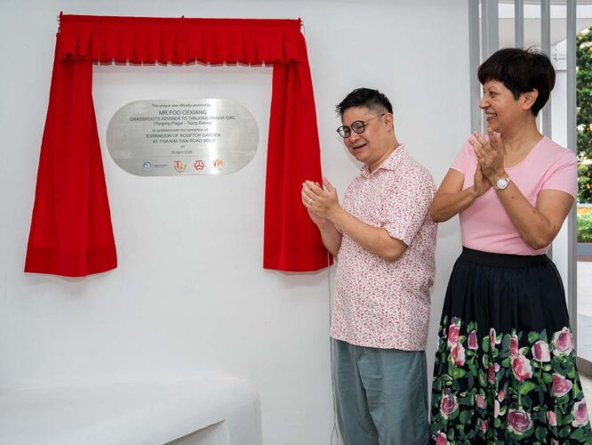 Upon arrival, Mr Foo and Minister Indranee were warmly greeted by residents and took time to interact with them before proceeding to the official ceremony. The launch was marked by the cutting of an eco-friendly “ribbon” made out of pandan leaves and vines harvested from the garden, followed by the unveiling of a commemorative plaque.